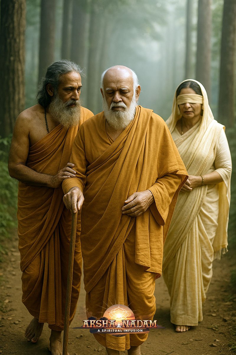 Dhritarashtra, once blinded by ambition and family bonds, now awakens to the call of inner renunciation and silently walks away into the forest of Gandhara, seeking liberation.
